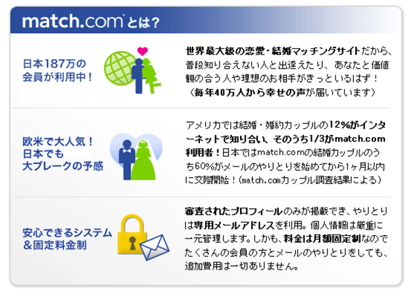 ⇒ マッチドットコム(Match)の口コミ・評判は?料金、退会方法、使い方まとめ